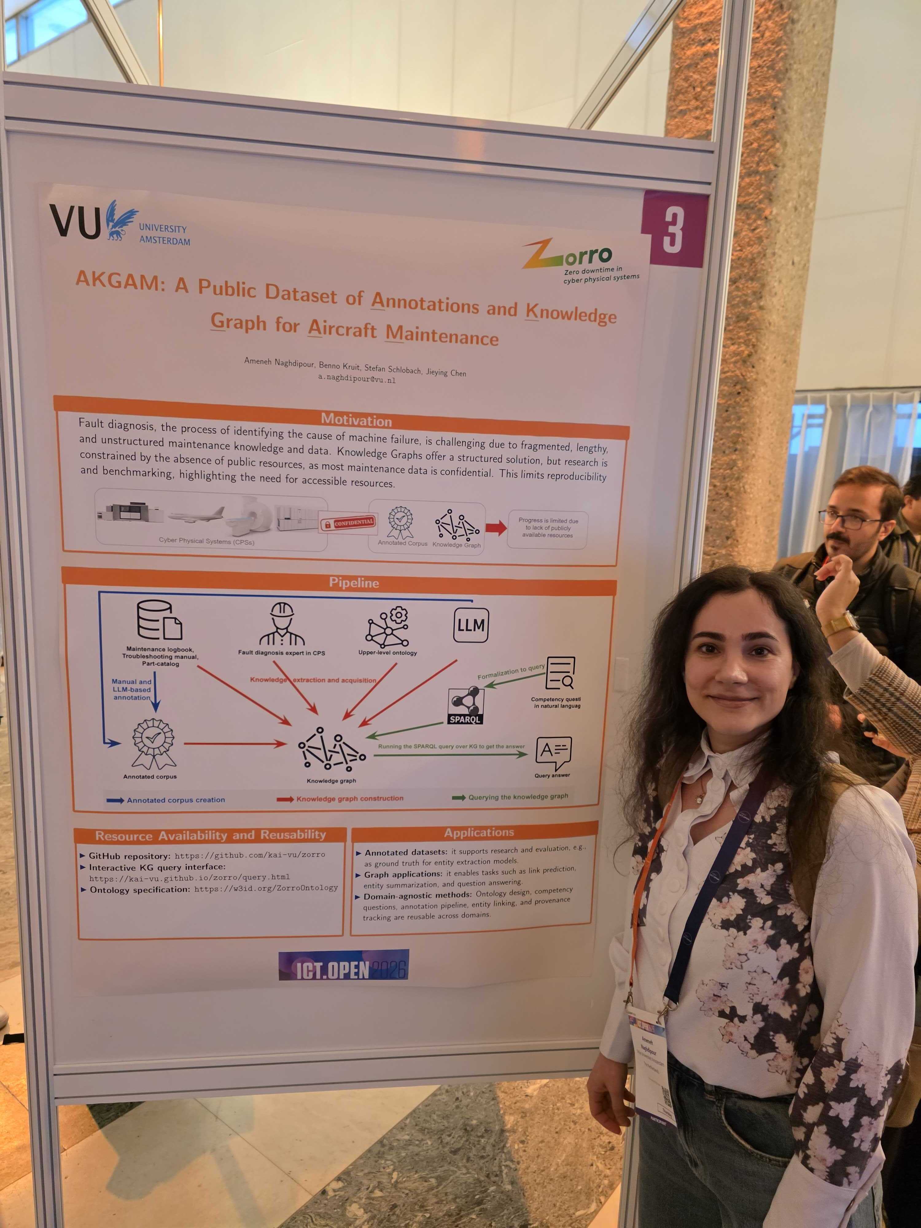 On Thursday, Ameneh and Ritten presented at ICTOpen. Ameneh presented her poster, “AKGAM: Public Dataset of Annotations and Knowledge Graph for Aircraft Maintenance,” at the Ontologies and Knowledge Graphs track of ICT-Open 2026. This work tackles the limitation of publicly available, domain-specific knowledge graphs and annotated corpora, with the aim of improving reproducibility and supporting further research. The released resources enable a range of applications. The annotated dataset supports research and evaluation tasks, such as serving as ground truth for entity extraction models. The knowledge graph itself facilitates downstream applications such as link prediction, entity summarization, question answering, etc. The methodology and pipeline used to construct these resources are designed to be domain-agnostic. Key components such as ontology design, competency question formulation, the annotation pipeline, entity linking, and provenance tracking can be reused across different domains.
